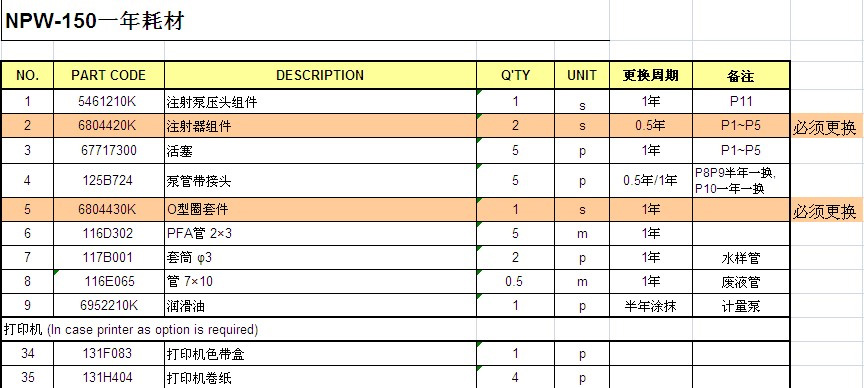 NPW150的一年維護備件?